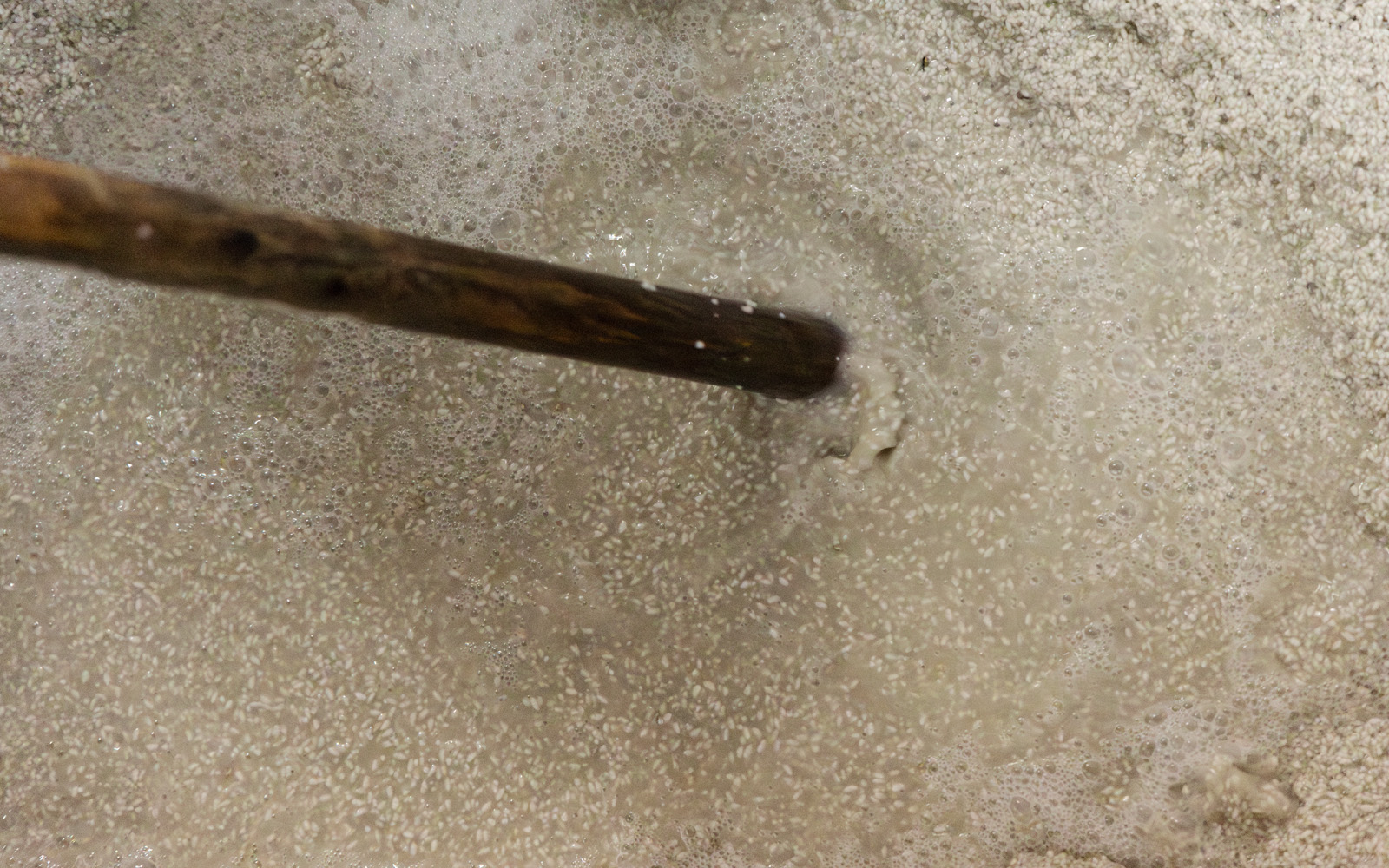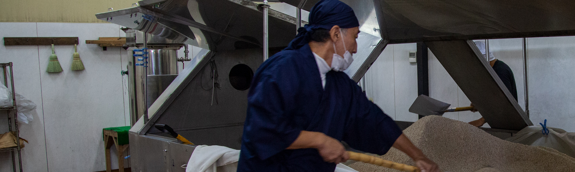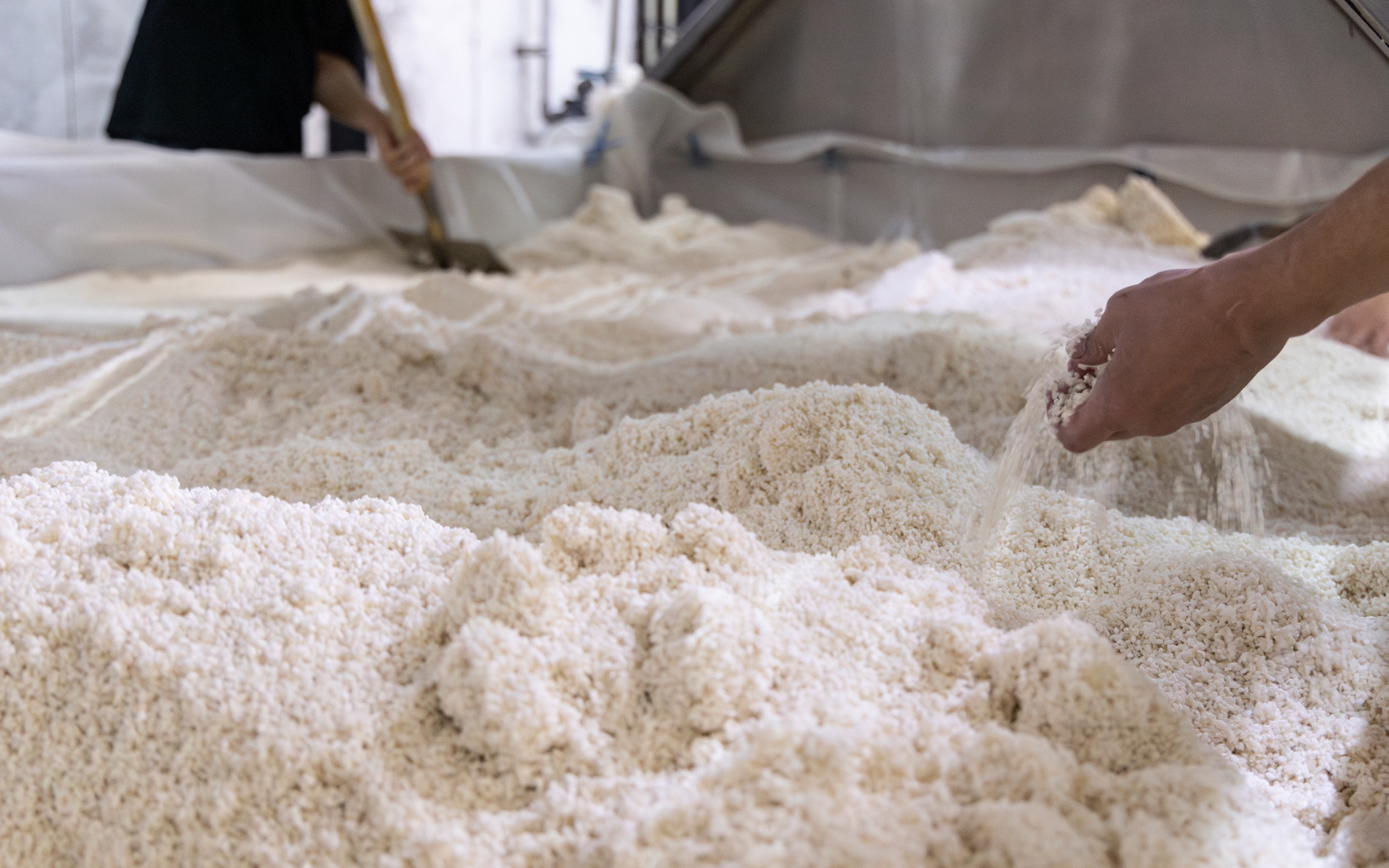 - 次日清晨,在配料前,再次進行手動攪拌作業,以「枯らし(乾化)」方式使麴的溫度均勻化和除去多餘的水分。
