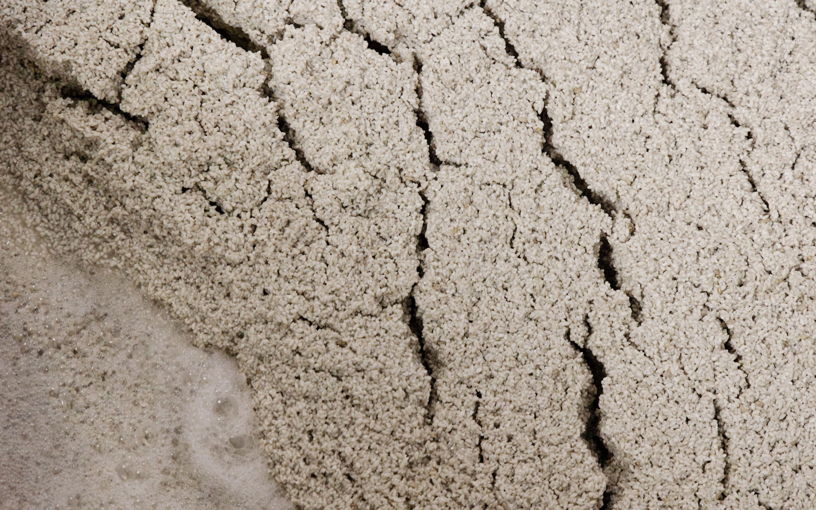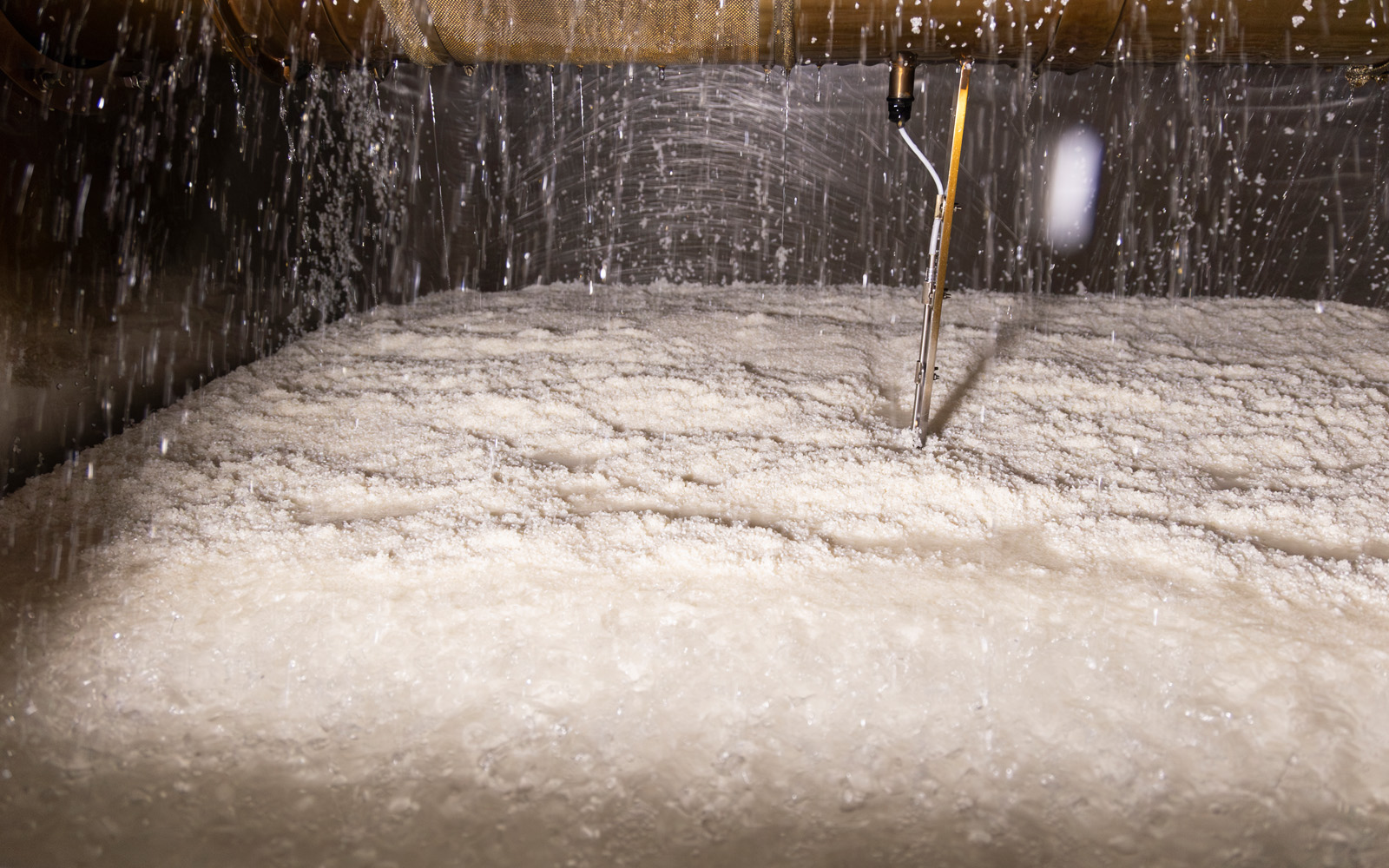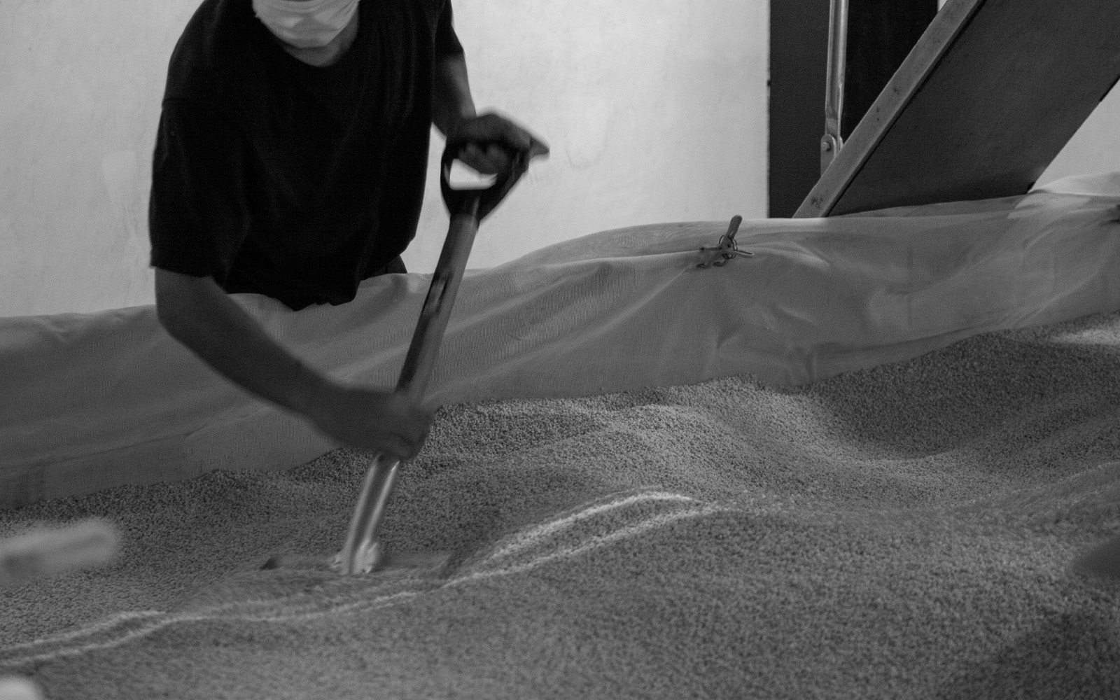 - 次日清晨,在配料前,再次進行手動攪拌作業,以「枯らし(乾化)」方式使麴的溫度均勻化和除去多餘的水分。